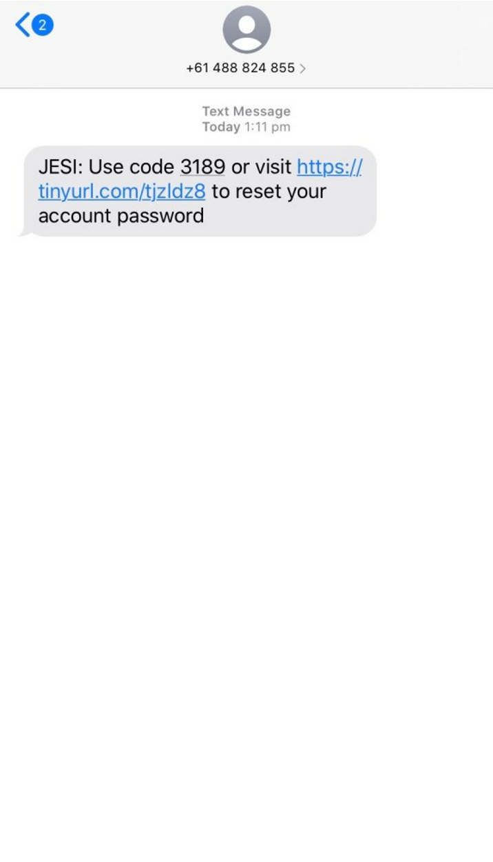 Isso irá gerar um SMS de redefinição de senha enviado para o seu número de celular no JESI – anote o código. |